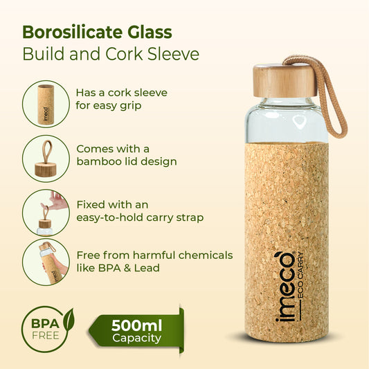 ECO CARRY Borosilicated Glass Water Bottle with Cork Sleeve Cover (500 ml) ECO CARRY Borosilicated Glass Water Bottle with Cork Sleeve Cover (500 ml)